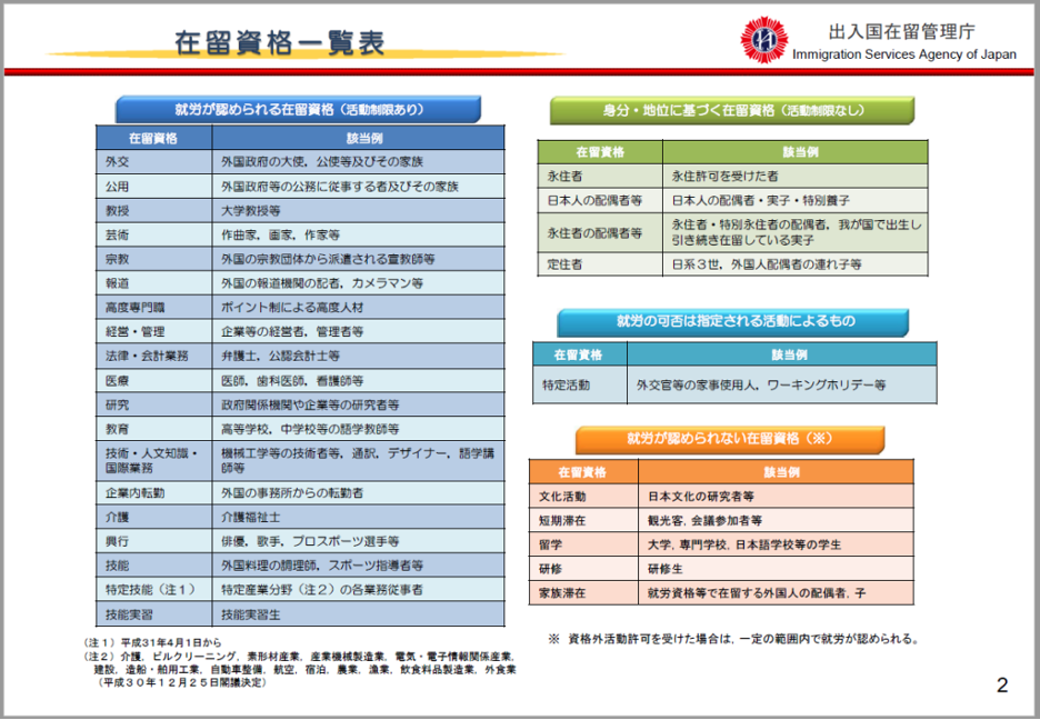 出典:出入国在留管理庁「在留資格一覧表」