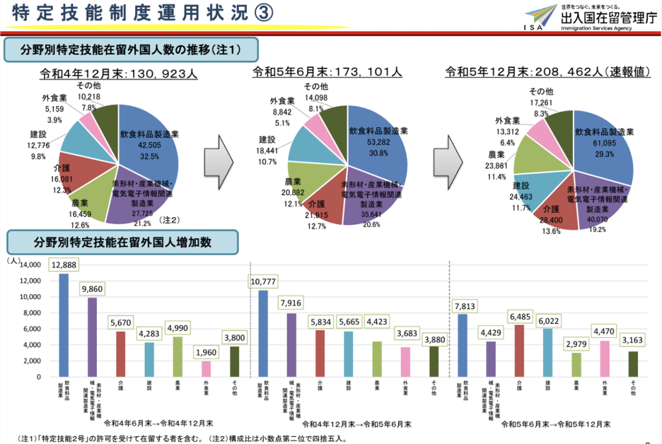 2019年に導入された新しい在留資格で、建設業や介護、農業、飲食などの特定分野で正社員として雇用が可能です。特定技能ビザは特に人手不足が深刻な産業で導入されており、今最も在留数の伸びが大きい就労ビザです。