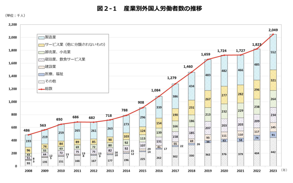 日本で働く外国人労働者数は、年々右肩上がりで増加しています。厚生労働省のデータによると、2023年10月末時点で外国人労働者数は200万人を突破しました。